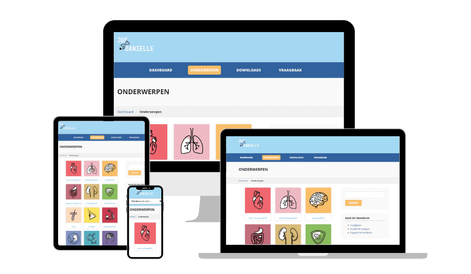 De Juf Danielle Academie maakt leren veel leuker! Met kleurrijke uitlegvideo’s, oefenvragen, Actieve Samenvattingen, Anatomie Kleurboeken en een vraagbaak waar je al jouw vragen kan stellen.